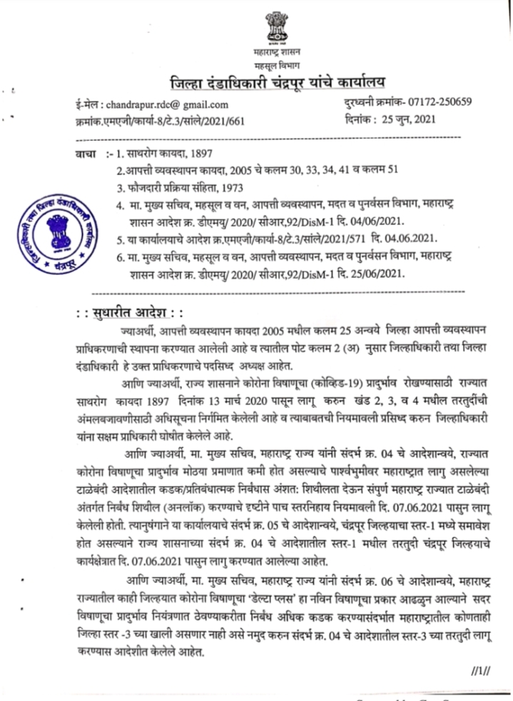 चंद्रपूर:- राज्यात डेल्टा प्लस व्हेरिएंट चा धोका लक्षात घेत राज्य सरकारने जिल्ह्यातील निर्बंधात आणलेली शिथिलता कमी केली असून आता अत्यावश्यक व बिगर अत्यावश्यक दुकानाच्या वेळा कमी करण्यात आल्या आहे, अत्यावश्यक व बिगर अत्यावश्यक प्रतिष्ठाने आता सकाळी 7 ते सायंकाळी 4 वाजेपर्यंत सुरू राहणार आहे.